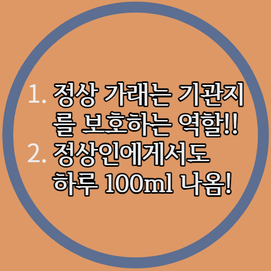 객담이라고 불리는 가래는 기관지나 폐로부터 생성되는 끈적끈적한 점액성 액체로서 정상인에게서도 하루에 100ml 정도 분비되는데 무의식적으로 삼켜 평소에 가래를 느끼지 못한다고 해요.