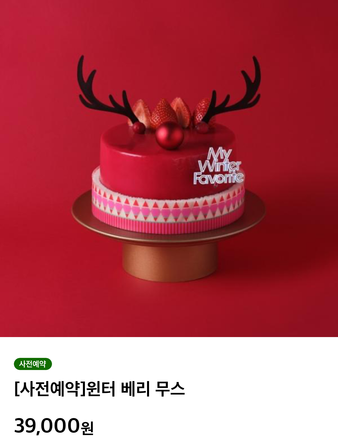 오른쪽 <윈터 베리 무스>는 39,000원이며 상큼한 베리 무스에 베리 라임 꿀리와 바닐라 크림을 레이어로 더하고 발로나 초코볼을 넣어 재미있는 식감을 살렸으며, 반짝이는 레드 글레이즈 옷을 입은 홀리데이 시즌 대표 케이크예요