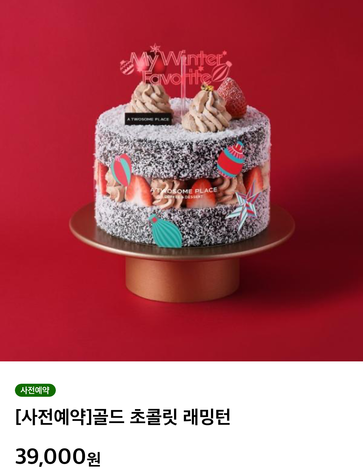 맛 : 호주 전통 디저트인 '래밍턴' 시트에 상큼한 라즈베리 콤포트와 골드 초콜릿 가나슈 크림으로 맛을 내고 초코 글레이즈를 코팅하여 코코넛 가루를 뿌린 케이크
