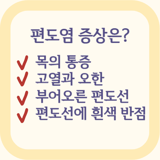 또한 편도염의 일반적인 증상은 목의 통증, 삼키기 어려움, 붉고 부어오른 편도선, 편도선에 흰색 또는 노란색 반점, 목의 선이 부어오른 것, 열, 긁히거나 흐린 목소리 등으로 나타나요.